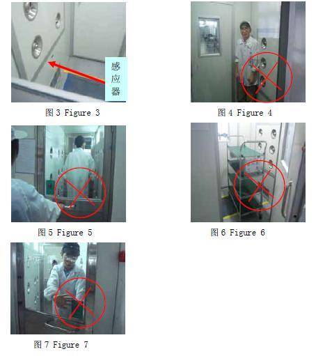 4.2.1進入風淋室前需看清里面是否有人(風淋系統工作時,不能用力使勁去推拉門,更不能強制性地將門打開,否則電鎖會被損壞)<如圖5>。