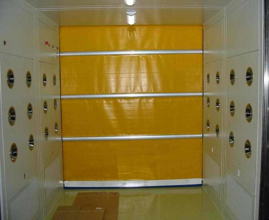 快速卷簾門風淋室-貨淋室是人員進入潔凈室所必需的通道,為了減少人員進出潔凈室所帶來的大量灰塵,在潔凈室的入口處安裝功能齊全的“氣閘室”可以減少空氣污染,當人員通過風淋室時,污染的塵埃粒子經過高效過濾的高度潔凈氣流射掉。